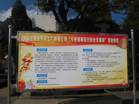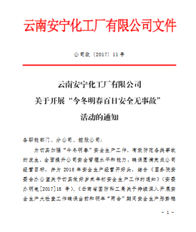 2017年11月21日公司制訂下發(fā)了《云南安寧化工廠有限公司關(guān)于開展“今冬明春百日安全無事故”活動的通知》(公司政[2017]11號),明確了活動主題、活動時間、活動內(nèi)容和活動要求。