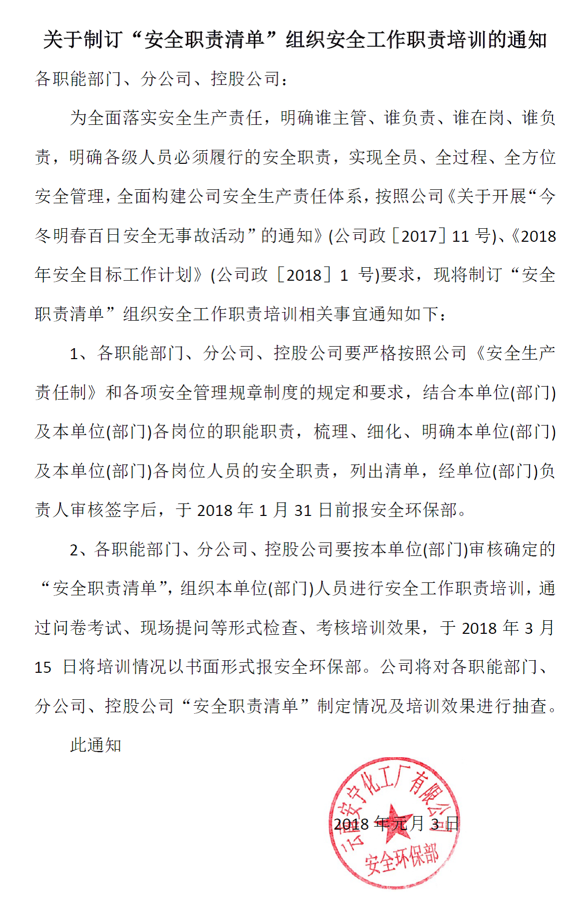 為確保2017年“今冬明春百日安全無事故”活動(dòng)開展的扎實(shí)有效,按照公司《關(guān)于開展“今冬明春百日安全無事故”活動(dòng)的通知》(公司政[2017]11號(hào))活動(dòng)要求,結(jié)合公司近期工作重點(diǎn),公司制訂下發(fā)了《關(guān)于制訂“職責(zé)清單經(jīng)”組織安全工作職責(zé)培訓(xùn)的通知》,要求各職能部門、分公司、控股公司認(rèn)真梳理、細(xì)化、明確本單位(部門)各級(jí)各類、各崗位人員的安全職責(zé),認(rèn)真組織職工學(xué)習(xí)了解、掌握本崗位安全職責(zé)并進(jìn)行考核。