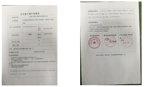 2月2日:1.上午9:15分,配合福保祥瑞公司接受安寧市工信局、安寧市疾控中心檢查組進(jìn)行復(fù)工復(fù)產(chǎn)準(zhǔn)備工作檢查;因消毒液、酒精、口罩、測溫儀物資稀缺、復(fù)工人員登記記錄還不夠全面等,要求繼續(xù)整改。2.經(jīng)多方籌集物資并對復(fù)工人員進(jìn)行詳細(xì)登記整改后,下午16:40分再次邀請檢查組對整改落實(shí)情況進(jìn)行復(fù)查。