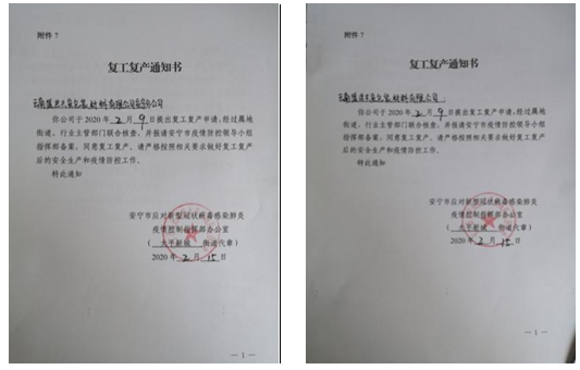 2月3日:1.安寧市工信局對福保祥瑞公司作準(zhǔn)予復(fù)工復(fù)產(chǎn)批復(fù),感到高興;2.安化社區(qū)借旭潤公司1支紅外線測溫儀使用。