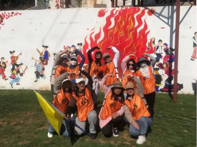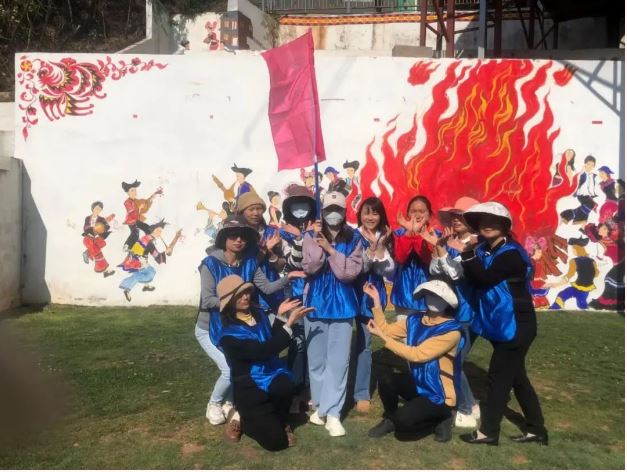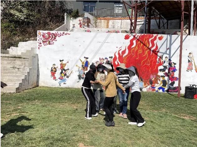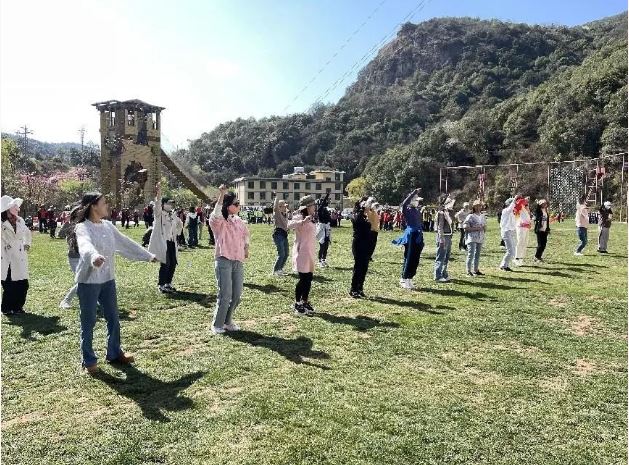 女職工們來到美麗的豹子箐,在教官的帶領(lǐng)下首先進行合影留念、破冰行動、熱身舞蹈。