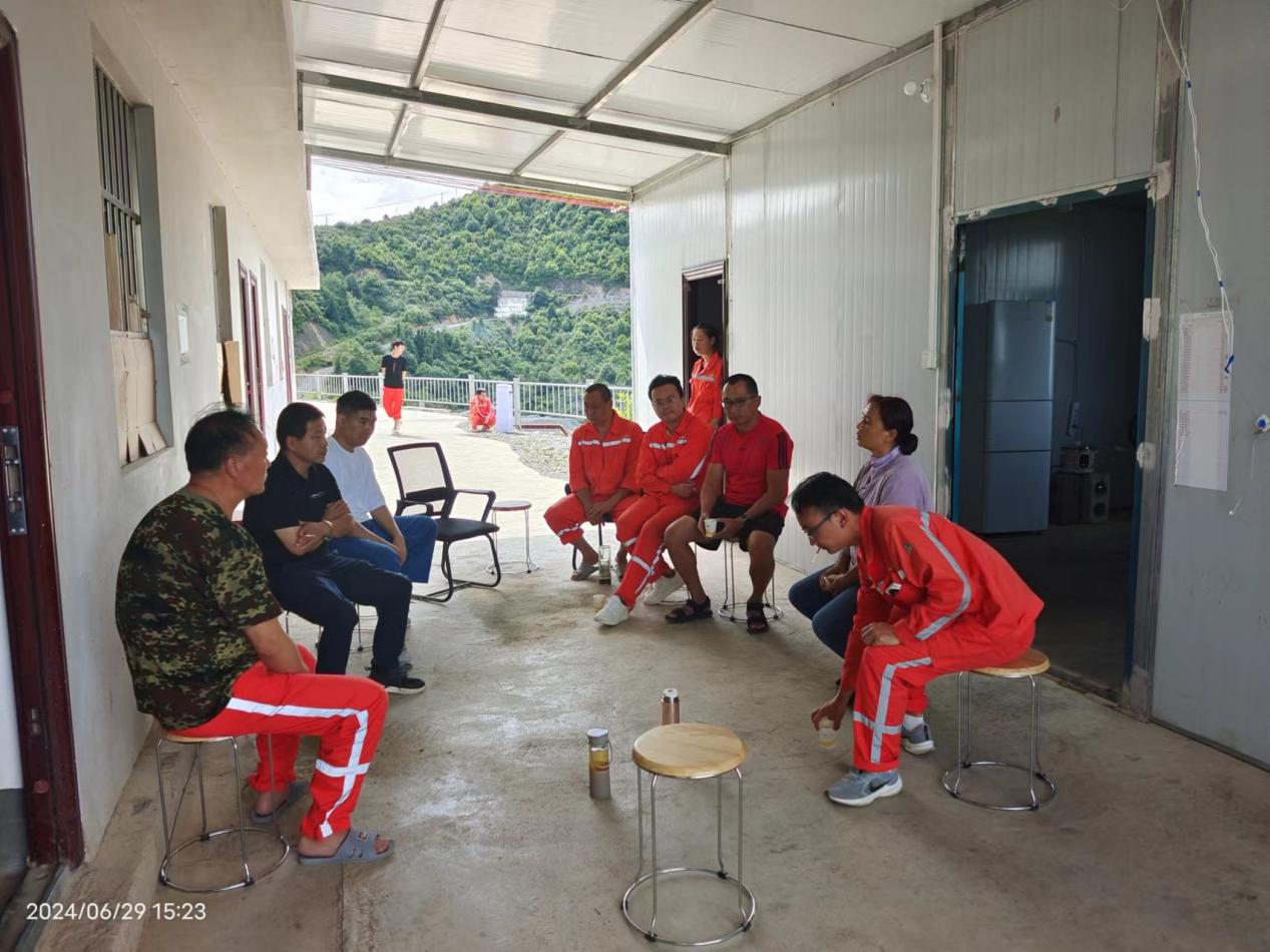 6月30日一早,我們又驅(qū)車趕往下一站--金平縣勐橋鄉(xiāng)棉花地遠(yuǎn)大礦業(yè)灣河鐵礦,看望在這里支援的1名同志。這里更加偏遠(yuǎn),一下車就感覺(jué)像進(jìn)了蒸籠,3、5分鐘渾身感覺(jué)濕漉漉的,不遠(yuǎn)處日夜轟鳴的機(jī)器聲讓人更覺(jué)悶熱。支援的這名同志與我們進(jìn)行了簡(jiǎn)單的交流后,又投入到緊張的支援工作中。后續(xù)我們又與神斧公司項(xiàng)目經(jīng)理等人進(jìn)行了座談交流,詳細(xì)了解了支援同志的基本情況,交流過(guò)程中分公司負(fù)責(zé)人肯定了支援同志勤勤懇懇的工作態(tài)度,并叮囑大家要趁著年輕學(xué)好本領(lǐng)。