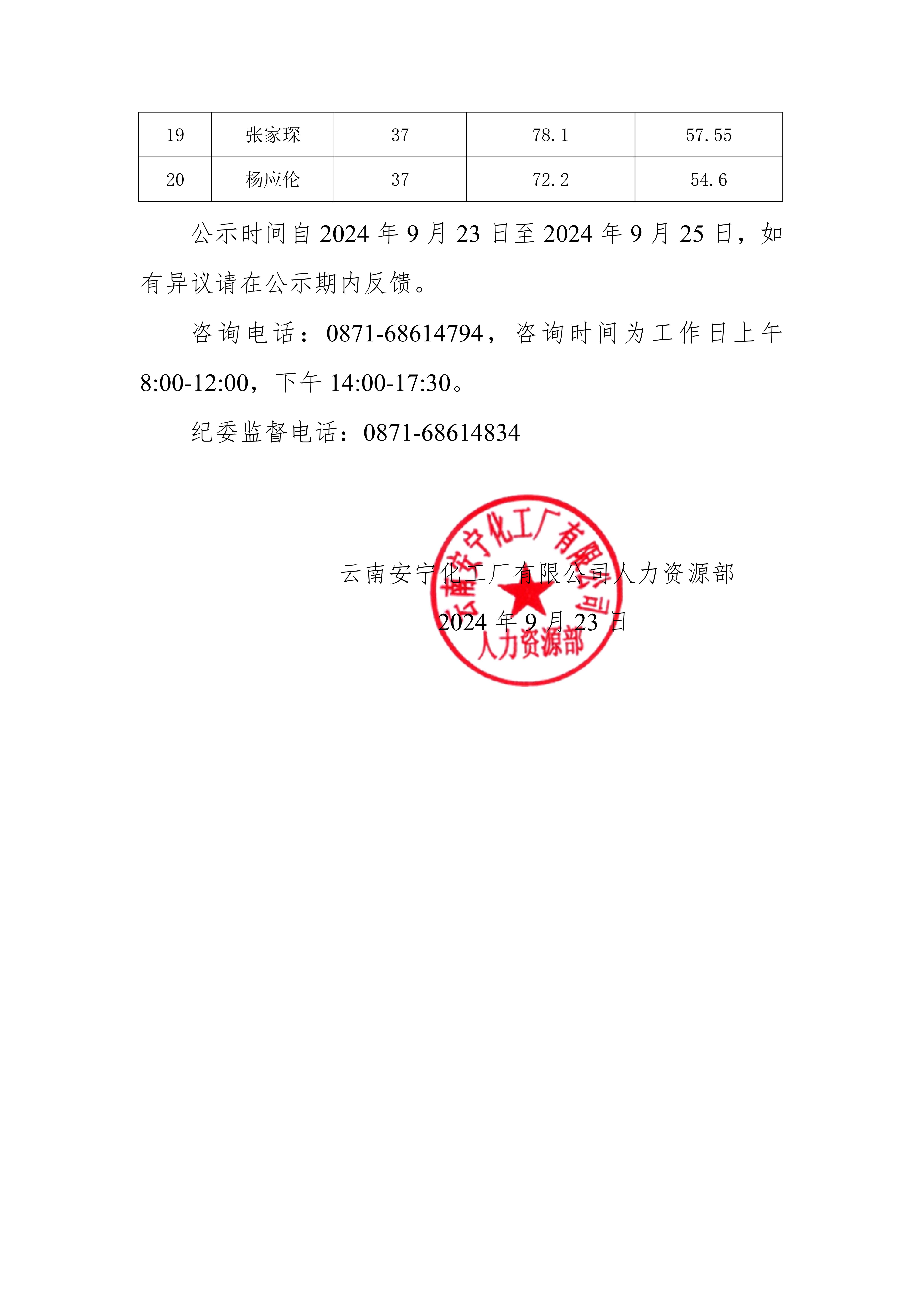 云南安寧化工廠有限公司2024 年公開招聘綜合成績(jī)公示