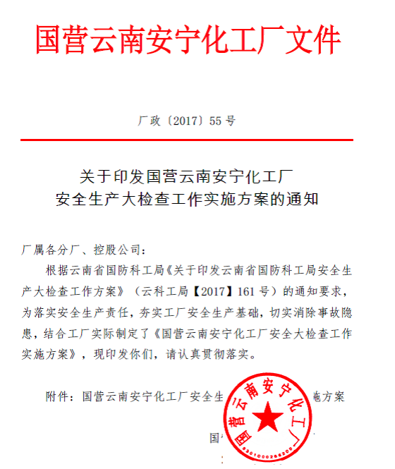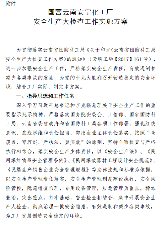 為認(rèn)真貫徹落實(shí)《國(guó)務(wù)院安全生產(chǎn)委員會(huì)關(guān)于開(kāi)展全國(guó)安全生產(chǎn)大檢查的通知》(安委明電〔2017〕3 號(hào))、云南省安全生產(chǎn)委員會(huì)《云南省安全生產(chǎn)委員會(huì)辦公室關(guān)于印發(fā)云南省安全生產(chǎn)大檢查工作督查方案的通知》(云安辦[2017]45 號(hào))、云南省國(guó)防科工局《關(guān)于印發(fā)<云南省國(guó)防科工局安全生產(chǎn)大檢查工作方案>的通知》(云科工局[2017]161 號(hào))文件,工廠從學(xué)習(xí)動(dòng)員、制定方案、自查自糾、整改落實(shí)等環(huán)節(jié)扎實(shí)開(kāi)展工作,為黨的十九大勝利召開(kāi)營(yíng)造穩(wěn)定的安全環(huán)境。