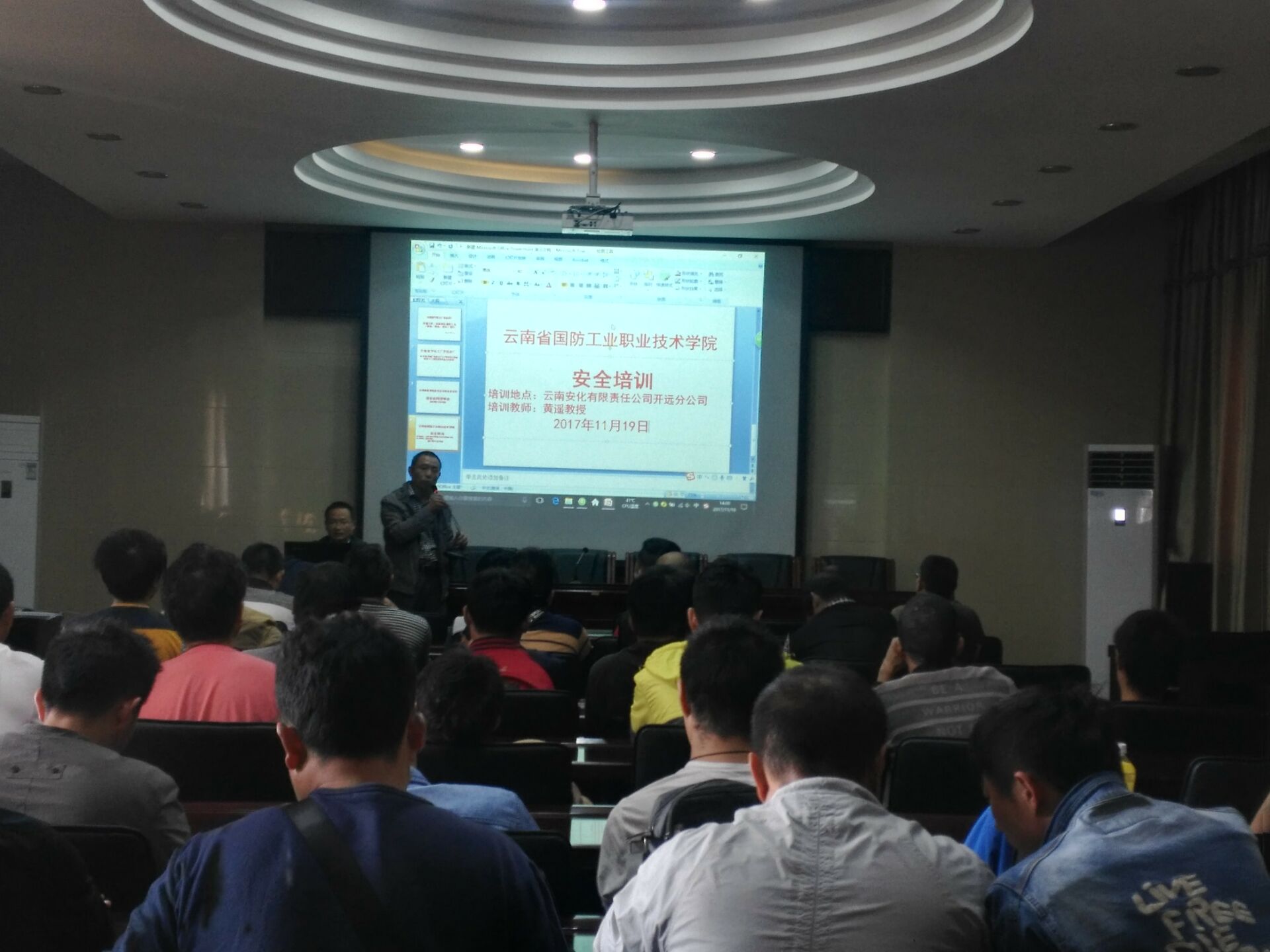 2017年11月19日,開遠(yuǎn)分公司聘請云南開放大學(xué)化學(xué)工程學(xué)院夏建才和黃遙副院長到分公司進(jìn)行安全培訓(xùn)。各科室負(fù)責(zé)人、生產(chǎn)車間職工、遠(yuǎn)安公司職工、專兼職安全員共71人參加培訓(xùn)。